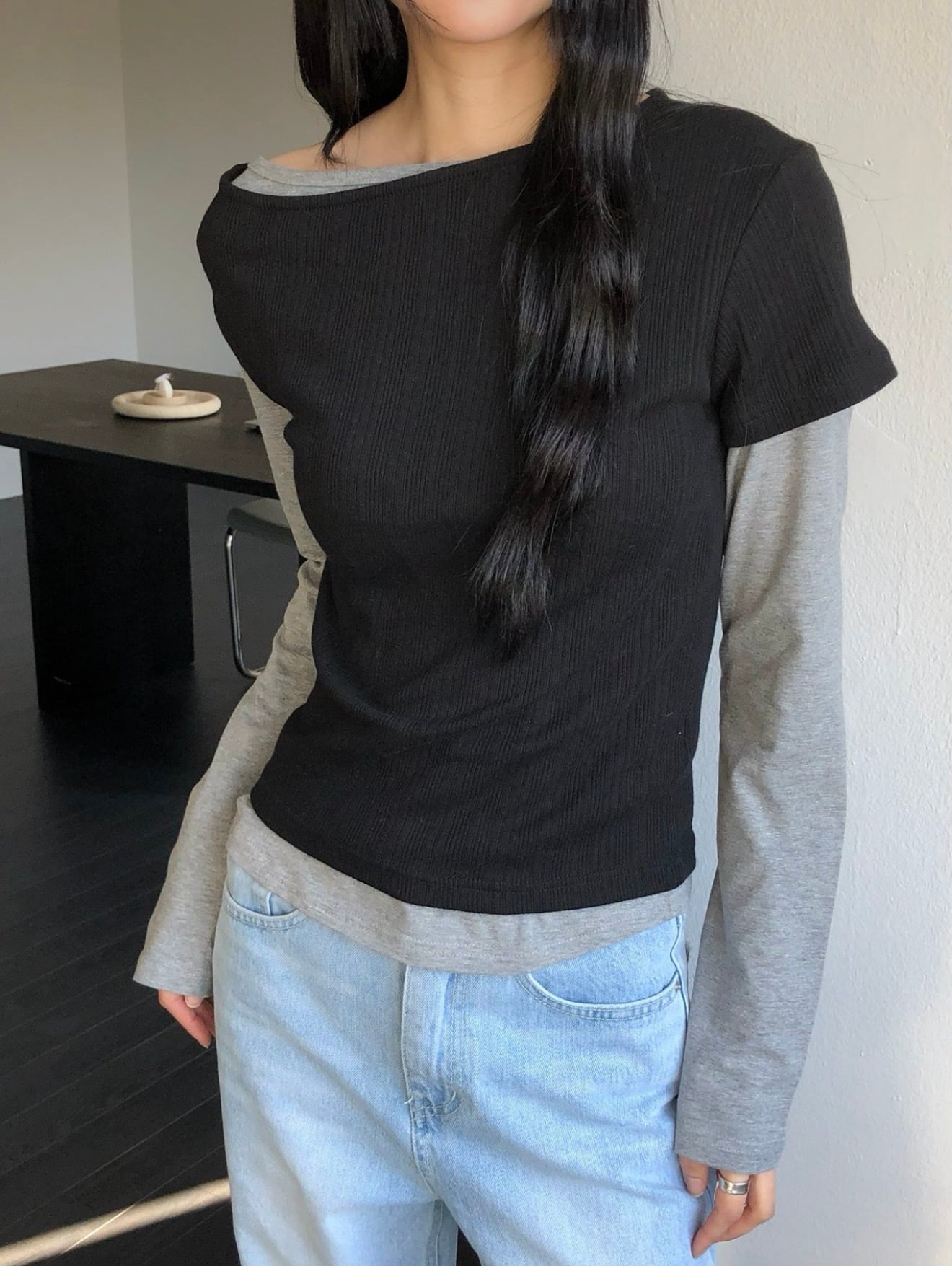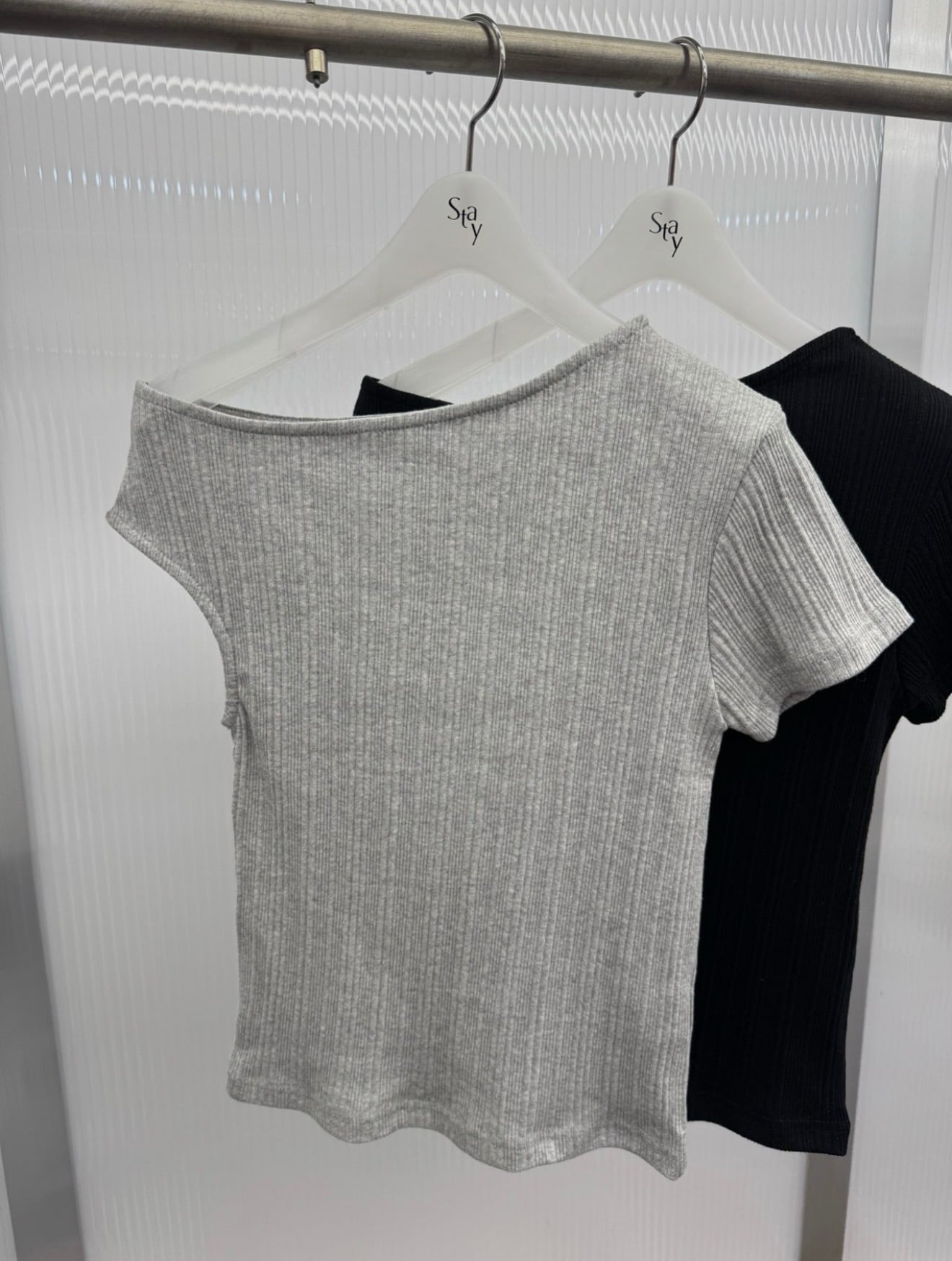 オフショルダーリブTシャツ