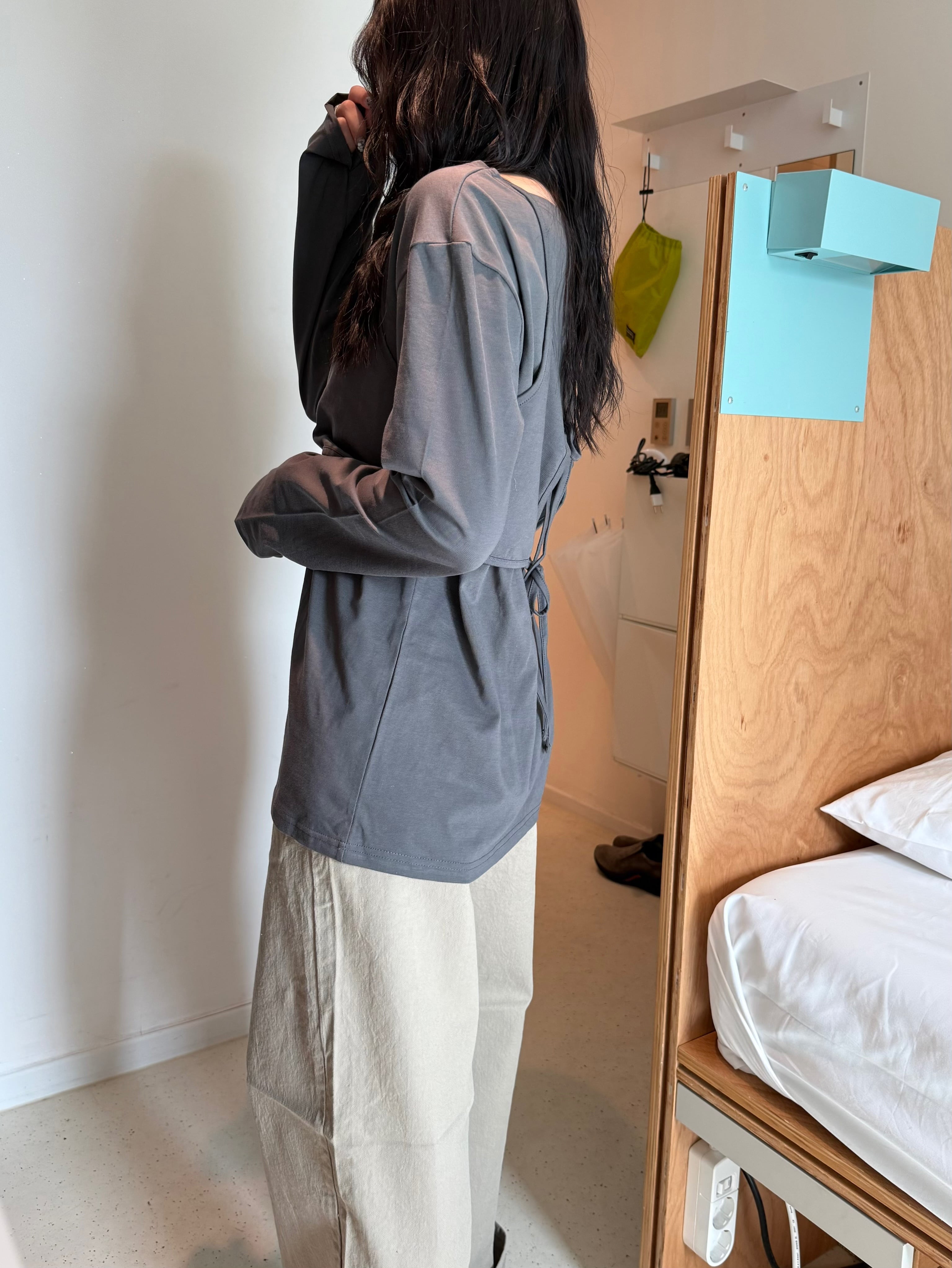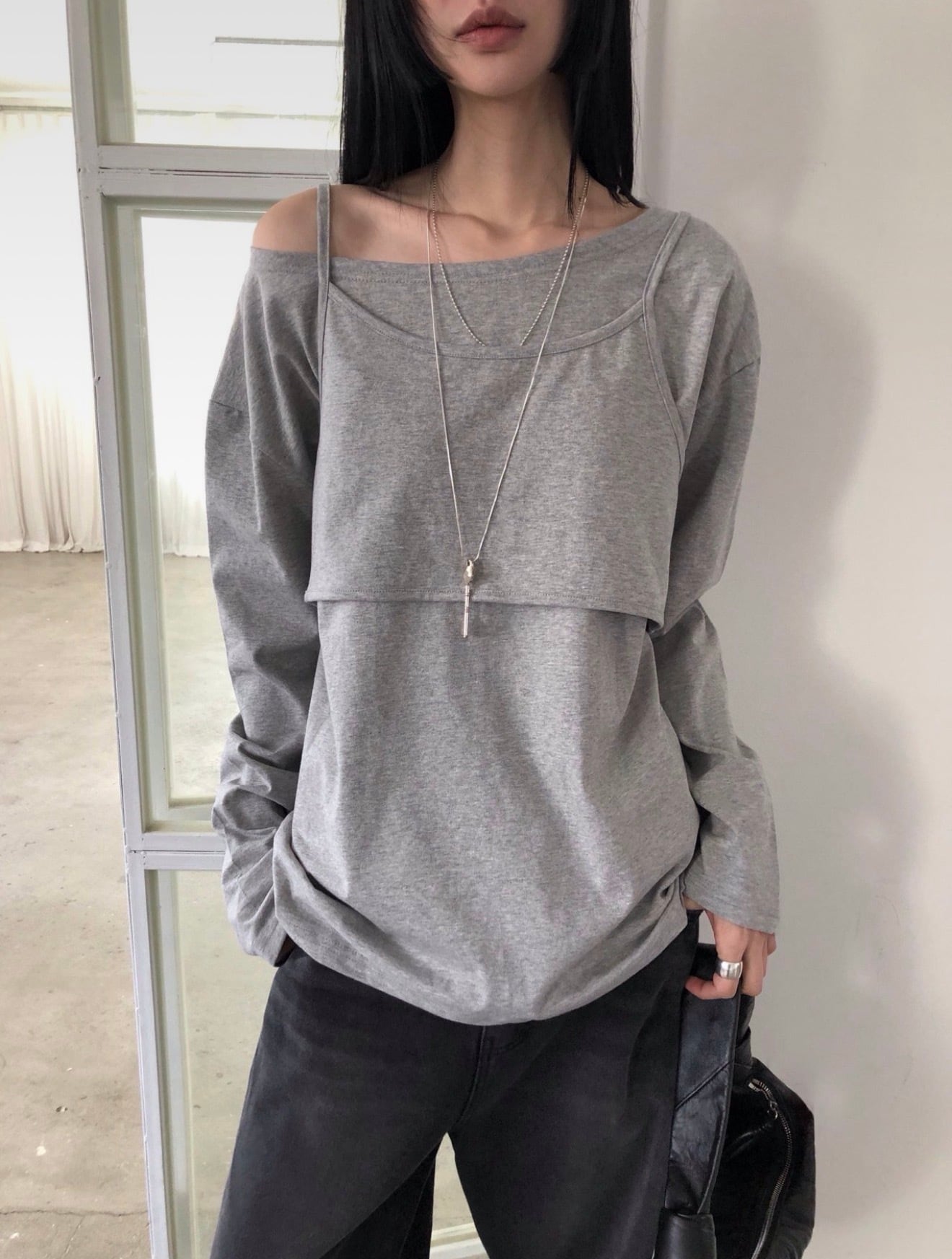 オフショルダーのロンTと、後ろの紐で調整可能なキャミソールのセットは、